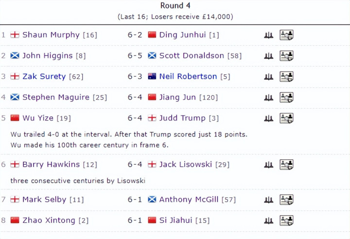 晋级16强的中国选手包括易资配,卫冕冠军丁俊晖、今年世锦赛冠军赵心童、世锦赛四强的斯佳辉、备受期待的吴宜泽,以及本次比赛强势爆发的江俊。1/8决赛,丁俊晖迎战老对手“魔术师”肖恩-墨菲、吴宜泽挑战世界第一“准度王”特鲁姆普。