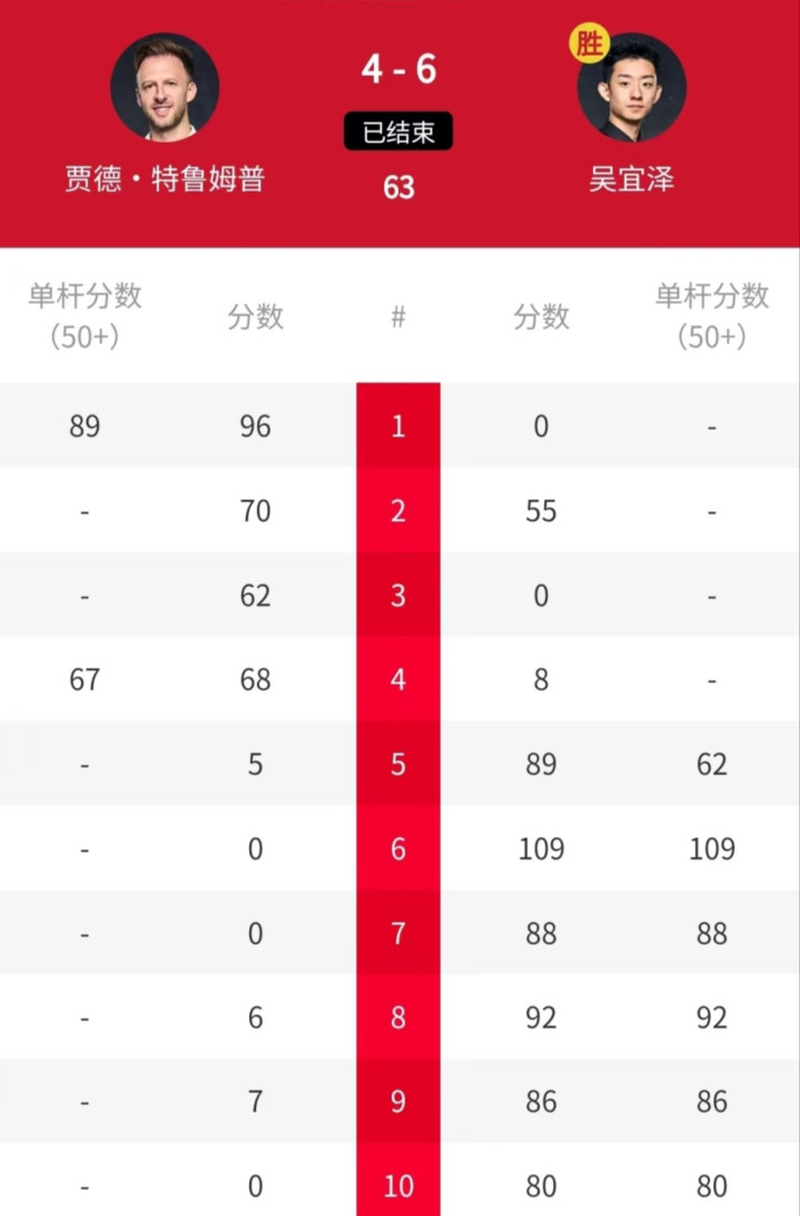 而在吴宜泽挑战世界第一特鲁姆普的比赛中,他在开场表现不佳,0-4落后。特鲁姆普晋级似乎非常容易。但是在下半场,吴宜泽强势爆发,他轰出一波6连鞭,总比分6-4逆转晋级。